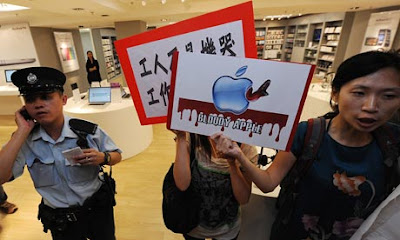 | Los manifestantes demuestran fuera de una tienda de Apple en Hong Kong en un día como recuerdo para los trabajadores de Foxconn que se han suicidado. Fotografía: Mike Clarke / AFP |